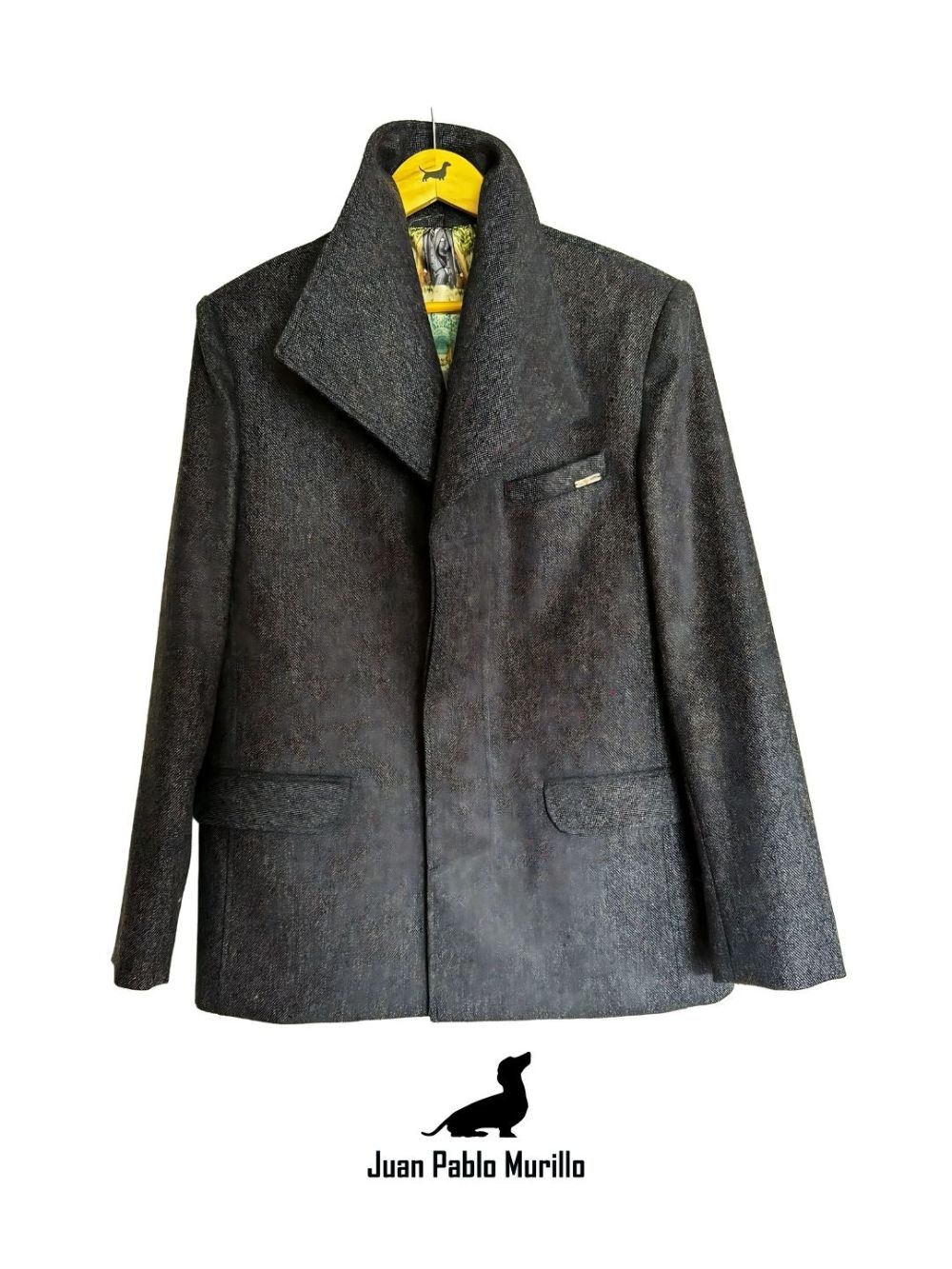Destaca por su cuello especial alto, de construcción amplia, que le da un carácter único y sofisticado. El frente central se cierra con tres botones ocultos bajo tapabotón, manteniendo una estética limpia y minimalista.