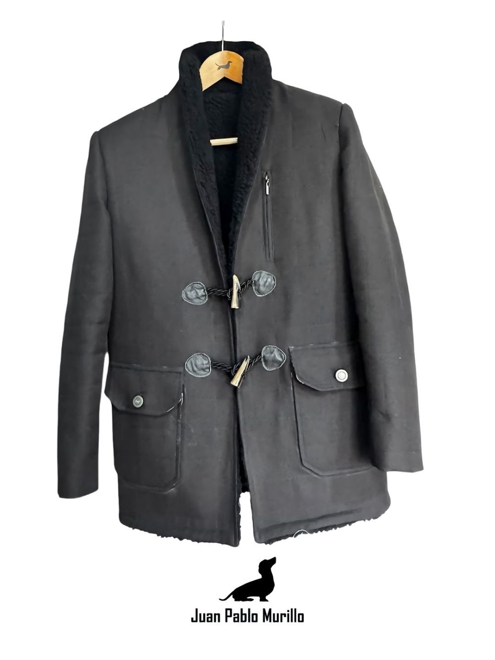 Su cuello estilo smoking aporta un toque refinado, mientras que el frente central cuenta con un original cierre de cacho y botones especiales que lo distinguen de cualquier abrigo convencional. Incluye un bolsillo en el pecho con cremallera vertical, ideal para objetos de valor, y dos bolsillos laterales tipo parche con tapas y botones que suman funcionalidad y presencia estética.