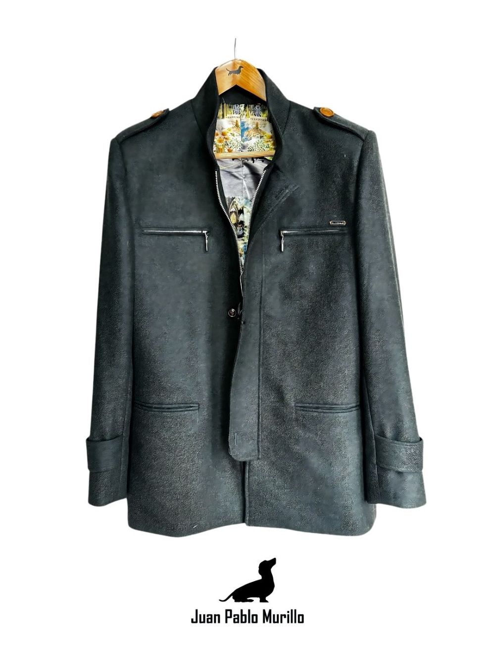 Chaqueta slim fit verde oscuro con cierre oculto, doble bolsillo en pecho con cremallera, charreteras con botones de madera y puños decorados. Estilo sofisticado con diseño estructurado.