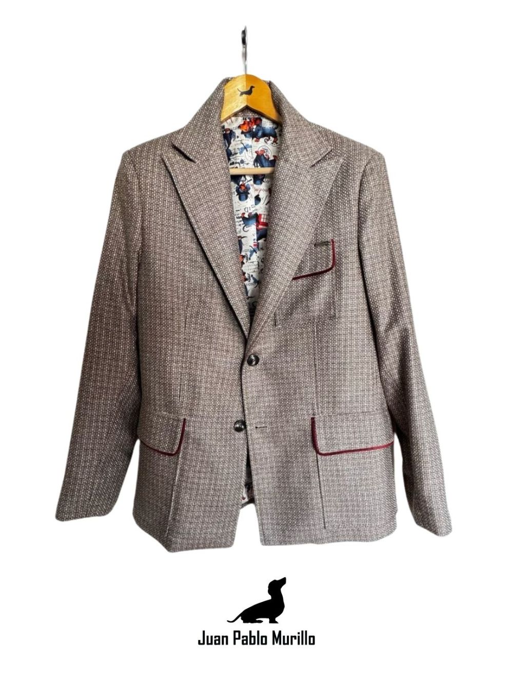 Cuenta con un cuello en punta y un frente central de dos botones, que realzan su estructura atemporal. En la parte frontal se destacan tres bolsillos estilo parche: uno en el pecho y dos inferiores, todos finamente adornados con un sesgo vinotinto que aporta un contraste sofisticado y sutil.