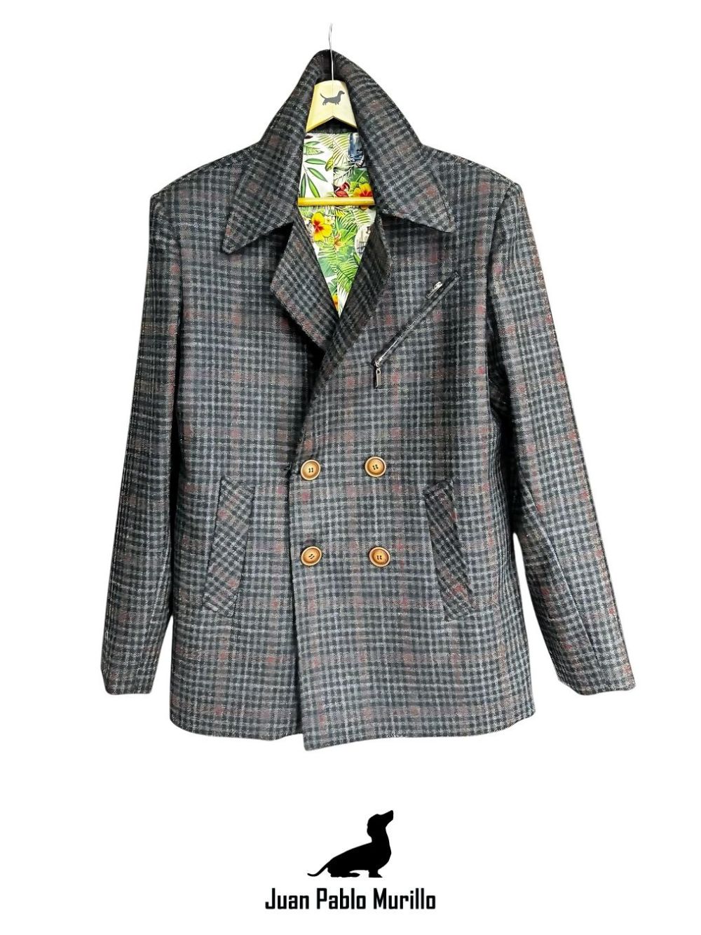 Chaqueta cruzada slim fit en paño italiano con diseño de cuadros, botones de madera y detalles metálicos. Sofisticada, funcional y con mucha personalidad.